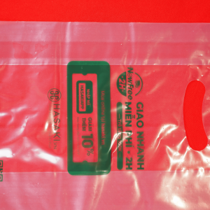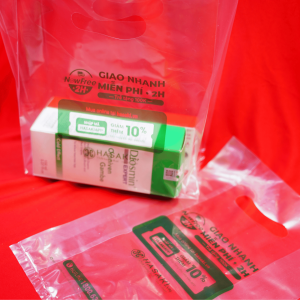 Bao PE trong, in 1 màu, xếp hông, có đục lỗ tay cầm